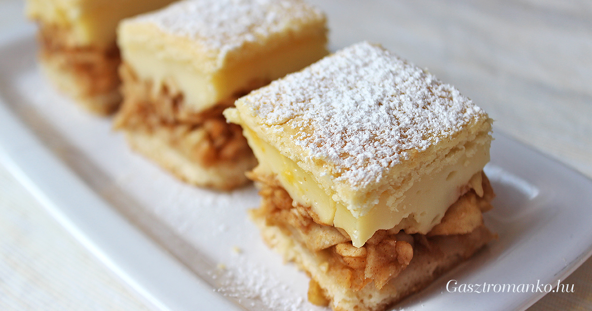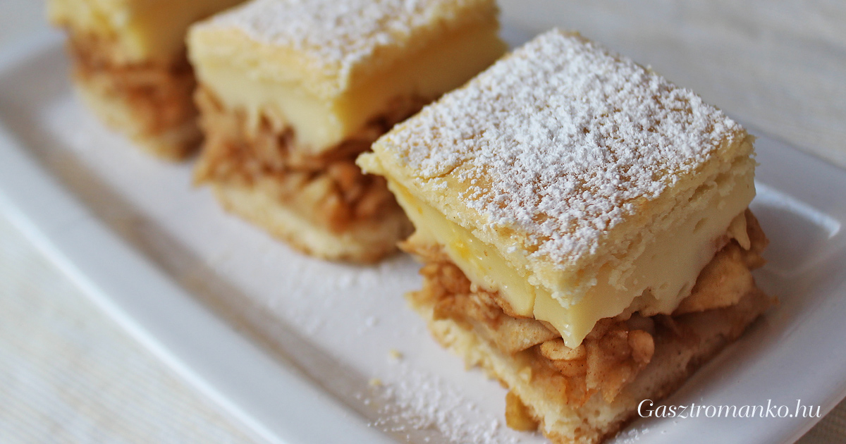 Omlós tészta, szaftos fahéjas almaréteg és krémes vaníliapuding egyetlen mennyei süteményben.